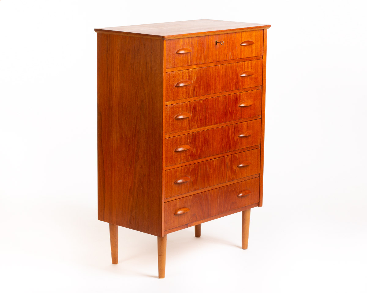 Nice vintage Danish chest of drawers from the sixties in teak, with elegant solid teak handles. The cabinet is finished with solid teak edges, beautiful handles, and dovetail joints in the drawers. Furthermore, the teak veneer has a beautiful drawing. The cabinet stands on tapered, slightly lighter legs.