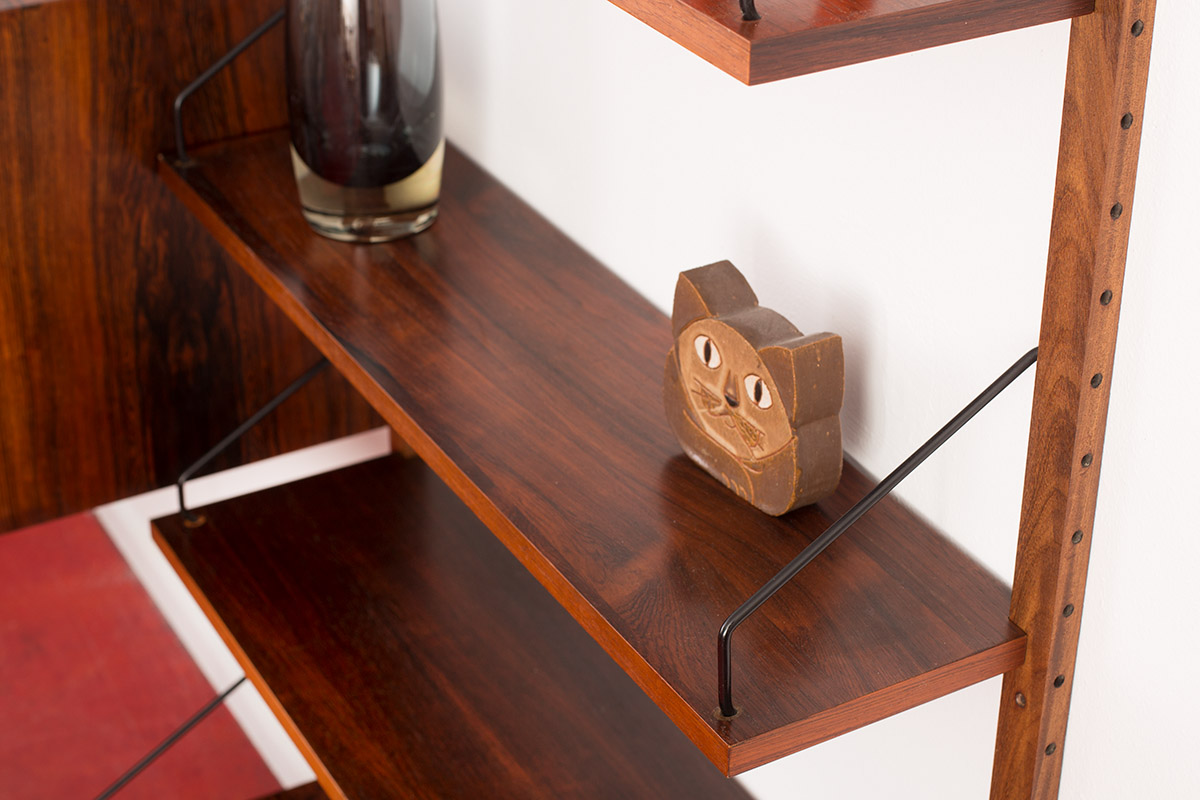 Prachtig wandsysteem ontworpen door de Deense ontwerper Poul Cadovius en geproduceerd door Cado. Dit exemplaar is uitgevoerd in palissander met een mooie tekening in het fineer, wat het meubel een chique uitstraling geeft. Deze wall unit bestaat uit 5 planken van 20 cm diep, een plank van 24 cm diep en een plank van 40 cm diep, daarnaast is er een klepkast met een gevlochten front met daarin twee laden en een metalen rekje binnenin. Deze kast is te gebruiken als secretaire. De hoge kwaliteit van afwerking is o.a te zien aan de fraaie zwaluwstaart verbindingen van de lades.